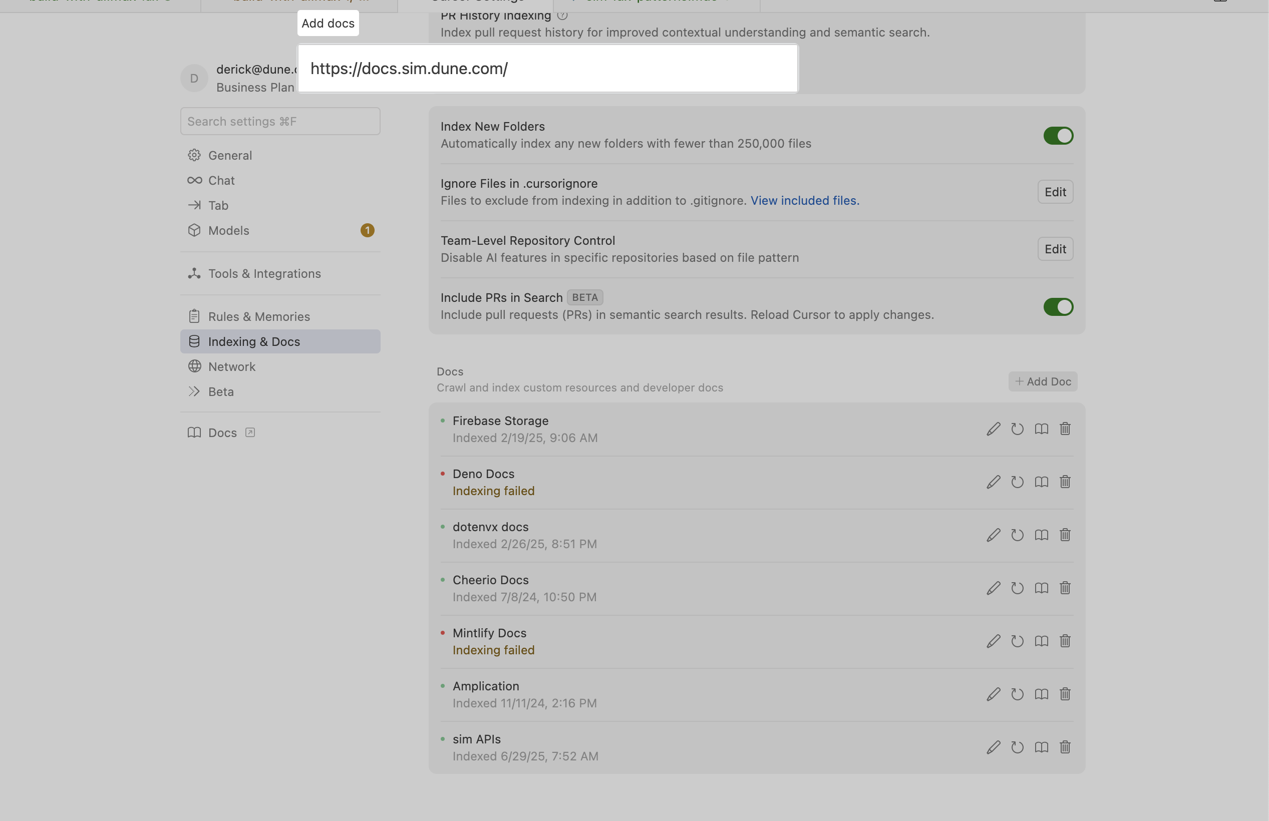 To integrate our documentation directly into your Cursor editor for easy reference:- Go to Cursor Settings -> Indexing & Docs -> Add Doc.