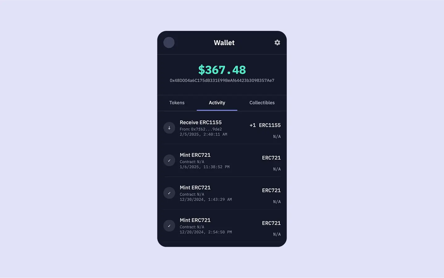 This makes the complete dataset available to our wallet.ejs template, enabling it to populate both the “Tokens” and “Activity” tabs with relevant, realtime onchain information.