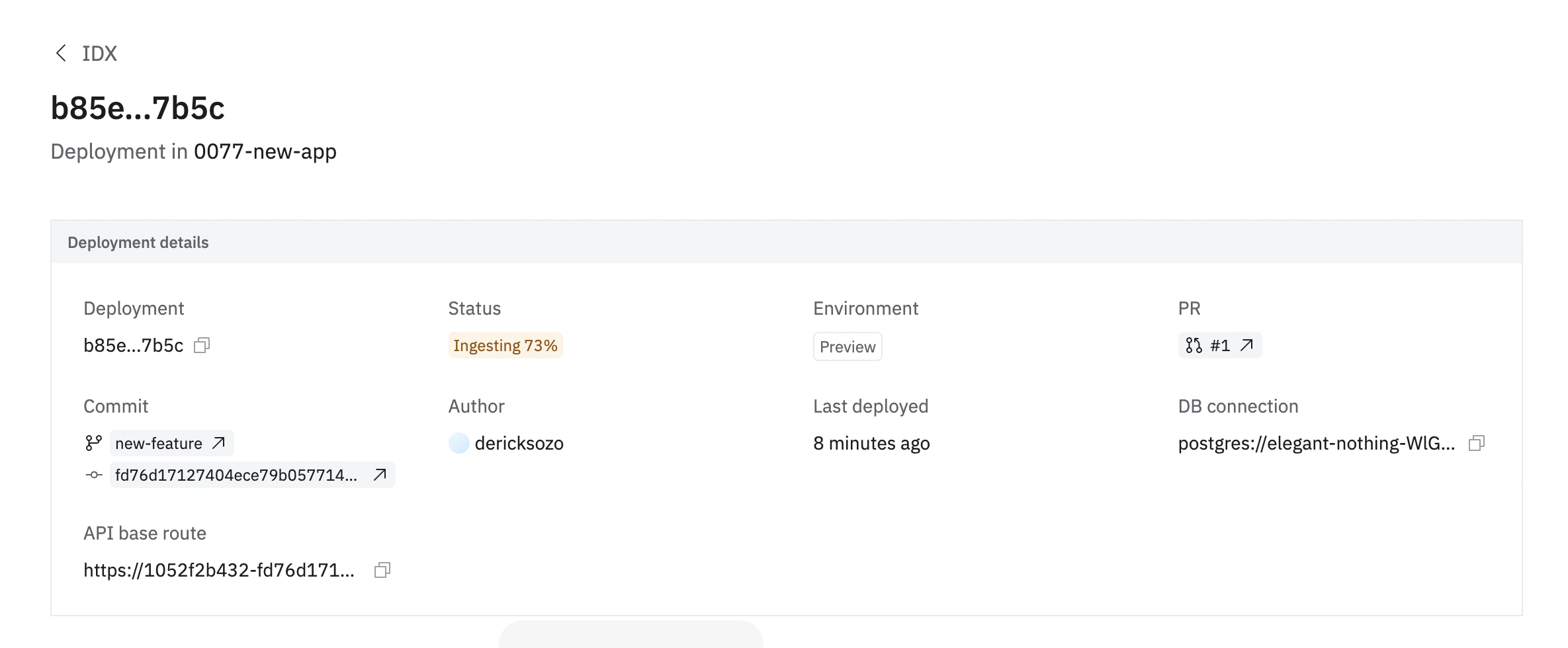 Sim IDX optimizes your development workflow through incremental deployments, which avoid unnecessary reprocessing when you make changes that don’t affect data ingestion. First Deployment per Branch: When you make the first commit to any branch (includingmain), Sim IDX triggers a complete build and ingestion process. Your code is compiled, a new database is provisioned, historical backfill begins from scratch, and new API endpoints are created.